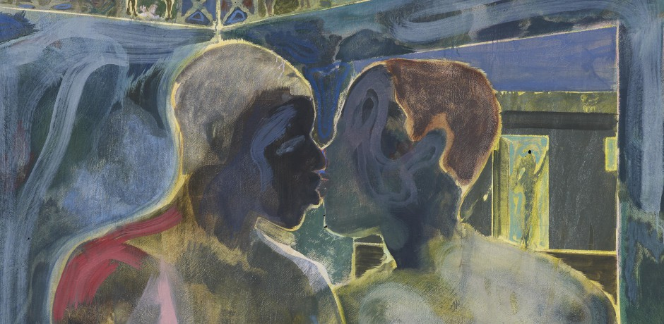 As opposed to mainstream representations of race and gender, Jordan Casteel’s portrayals of men offer intimacy and everyday reality. In an interview with Art Versed, Jordan Casteel notes, “I felt I needed to make a body of work that dealt with the humanity of men in my life, black men specifically, and that would show the vulnerable, sensitive side of them that I would encounter when at home or in intimate personal spaces.” With that the exhibition also takes under close scrutiny masculinity as a performance. Loulou Cherinet’s White Women video looks at stereotypes surrounding black men in the spectrum of gender. We are invited to a dinner table where men narrate personal stories concerning their experience with white women. As traditions, prejudices, work, marriage and flirting are discussed, the video cleverly exposes stereotypical roles attributed to black men, how they perceive white women as well as how they think white women perceive them. In no time, the viewer feels caught somewhere between being part of the dinner table and being an eavesdropper and the video offers an intimate conversation on the politics of race in the private sphere of love and sexuality. Michael Armitage’s portraits on the other hand show dream-like, almost fleeting visions of men and intimacy. Armitage’s choice of canvas, Lubugo, a traditional bark cloth from Uganda which has characteristic holes due to its process of production, creates intentional flaws on the portraits, increasing the dreamy effect. With pastel colours and misty images, both Campus Divas and Kampala Suburb offer the melodramatic imagery of race as well as queer sexuality with the socio-political climate of Kenya in focus.
