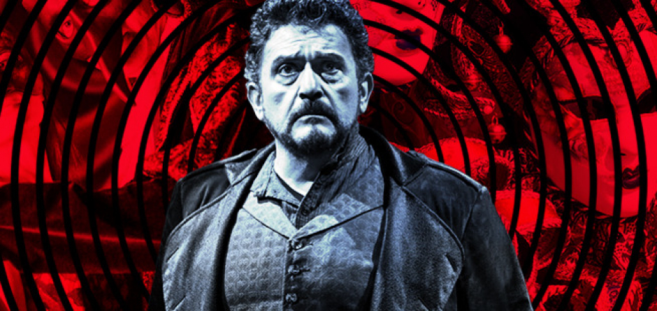 Verdi’s opera is loosely based on the real-life assassination of King Gustav III of Sweden, who was killed at a masked ball in 1792. The composer was forced to change the original setting from Sweden to Boston before its first performance, and the names of Gustavo and Anckarström became Riccardo and Renato (typical Bostonians). From the costumes, featuring smart three-piece suits and trench coats in varying shades of grey and beige, Opera North’s interpretation seems to be set somewhere around the 1930s or ‘40s, though there is no indication as to why this particular period was deemed preferable. Rather confusingly, the masked ball scene sees a sea of white powdered wigs and cast members clad in swathes of fuchsia fabric (but no masks). Hannah Clark’s imposing set design morphs pleasingly from a drab off-white office to the atmospheric red café in which Bardon’s mystic communes with Satan.