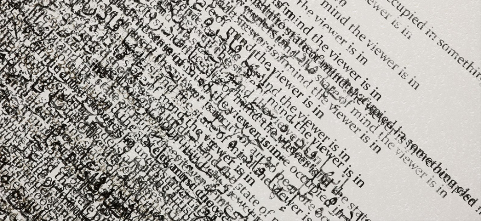 From a distance, Idris Khan’s newly commissioned wall drawing in Whitworth Art Gallery, with its etched, ink-colored surface, resembles something akin to an elongated whorl, or a flattened animal pelt—if on a monumental scale. At closer observation, one discovers the image comprises lines of text, repeated and overlaid, and printed using a rubber stamp.